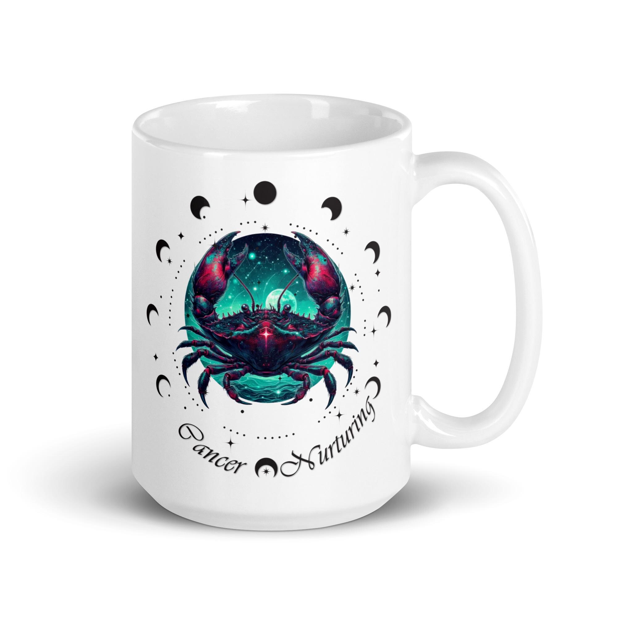 Zodiac Cancer – Moon Cycles, Stars, Colorful Design – White glossy mug